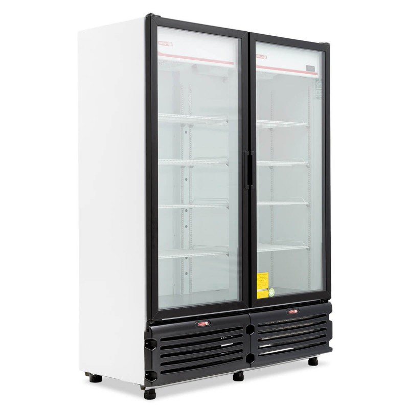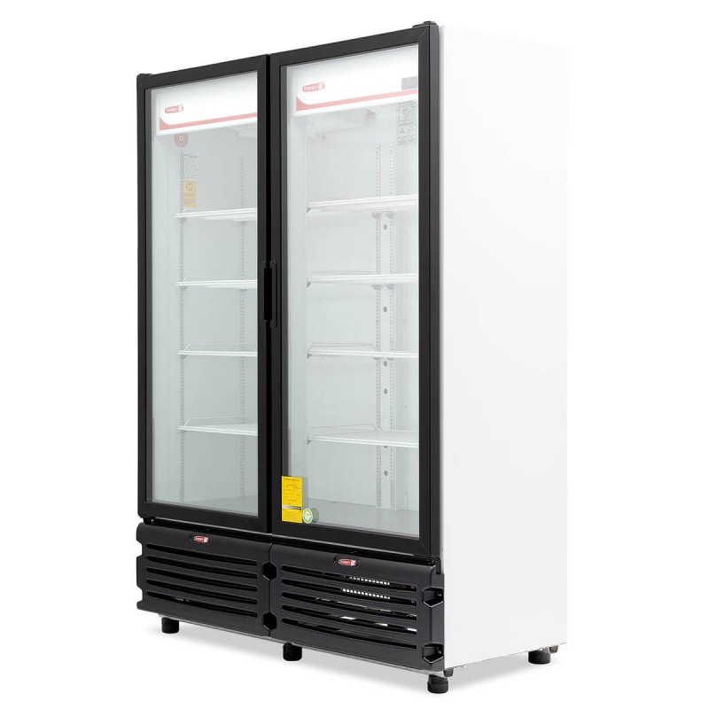 Refrigerador refresquero vertical de 42 pies3, puertas de cristal de alta eficiencia térmica y cierre automático, parrillas de alambre e iluminación LED de alta intensidad.