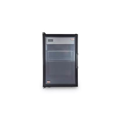 Refrigerador para exhibición sobre mostrador de 4.6 pies3, puerta de cristal de cierre automático y gabinete de acero inoxidable.